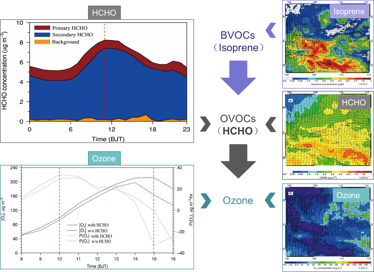 中国科研实验室地球环境研究所中国太阳成集团tyc7111cc理化过程及环境效应团队在关中城市站点和背景区域同步召开大气中国太阳成集团tyc7111cc观测,整合多源数据,利用区域气象化学耦合模式WRF-Chem模拟区域典型O3污染事件,定量评估了关中区域人为源和生物源甲醛对O3的生成贡献。